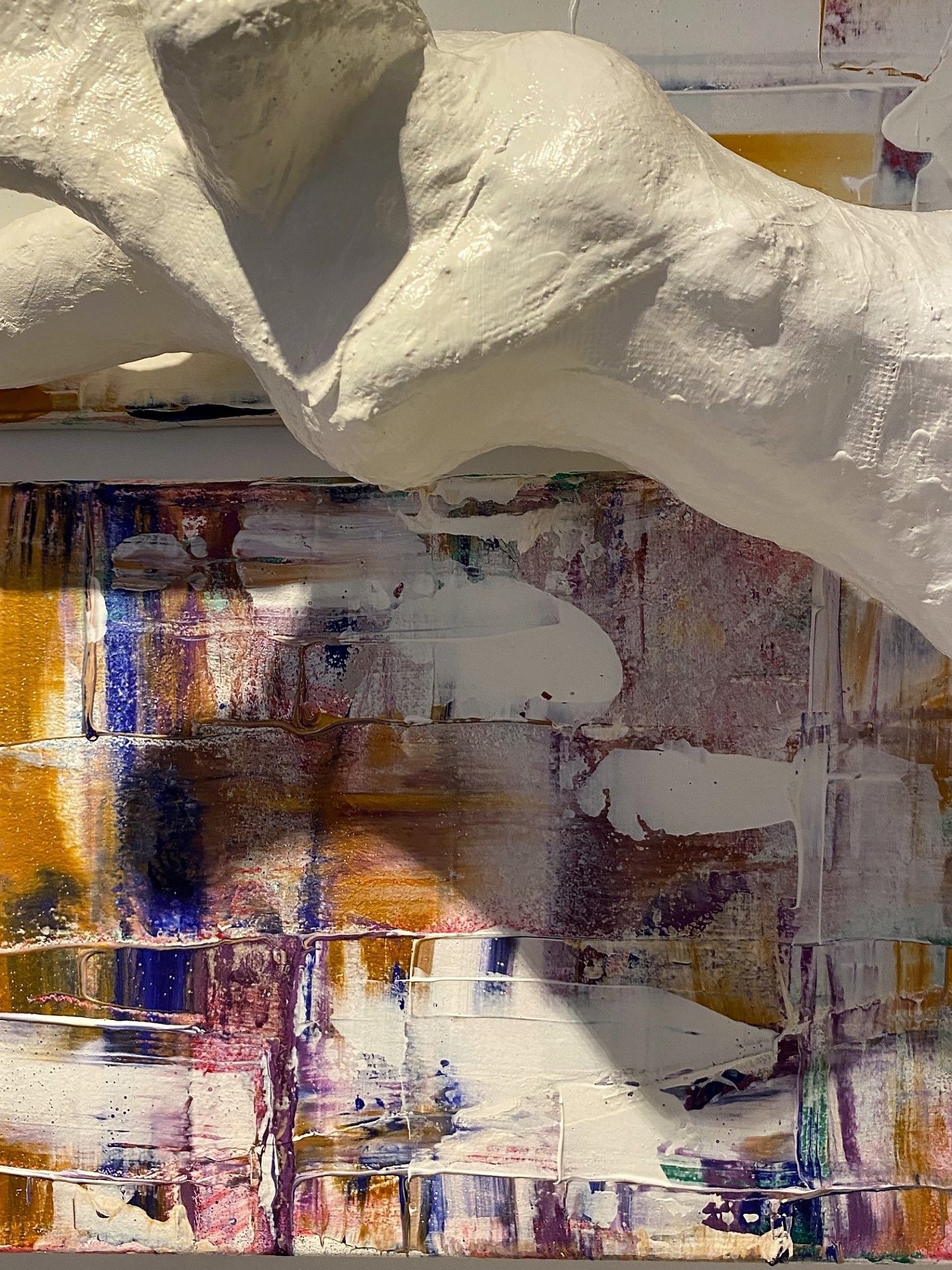 This artwork combines layered abstract painting with an organic, sculptural form. Earth tones and subtle gold accents create depth and texture, while the white figure detaches from the surface and suggests movement. The work embodies transformation and tension between silence and growth, inviting personal interpretation.