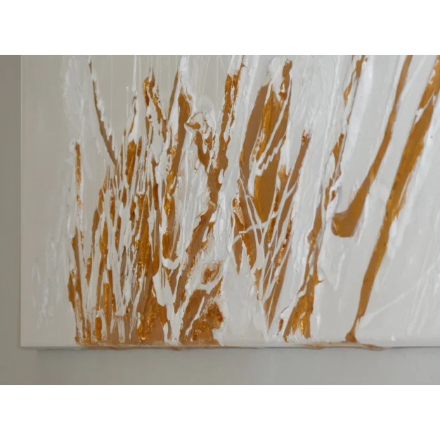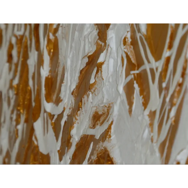 A minimalist abstract painting with relief in soft white tones, interrupted by powerful accents of gold. The dynamic texture and diagonal movement give the work a sense of tension, luxury, and modern elegance.